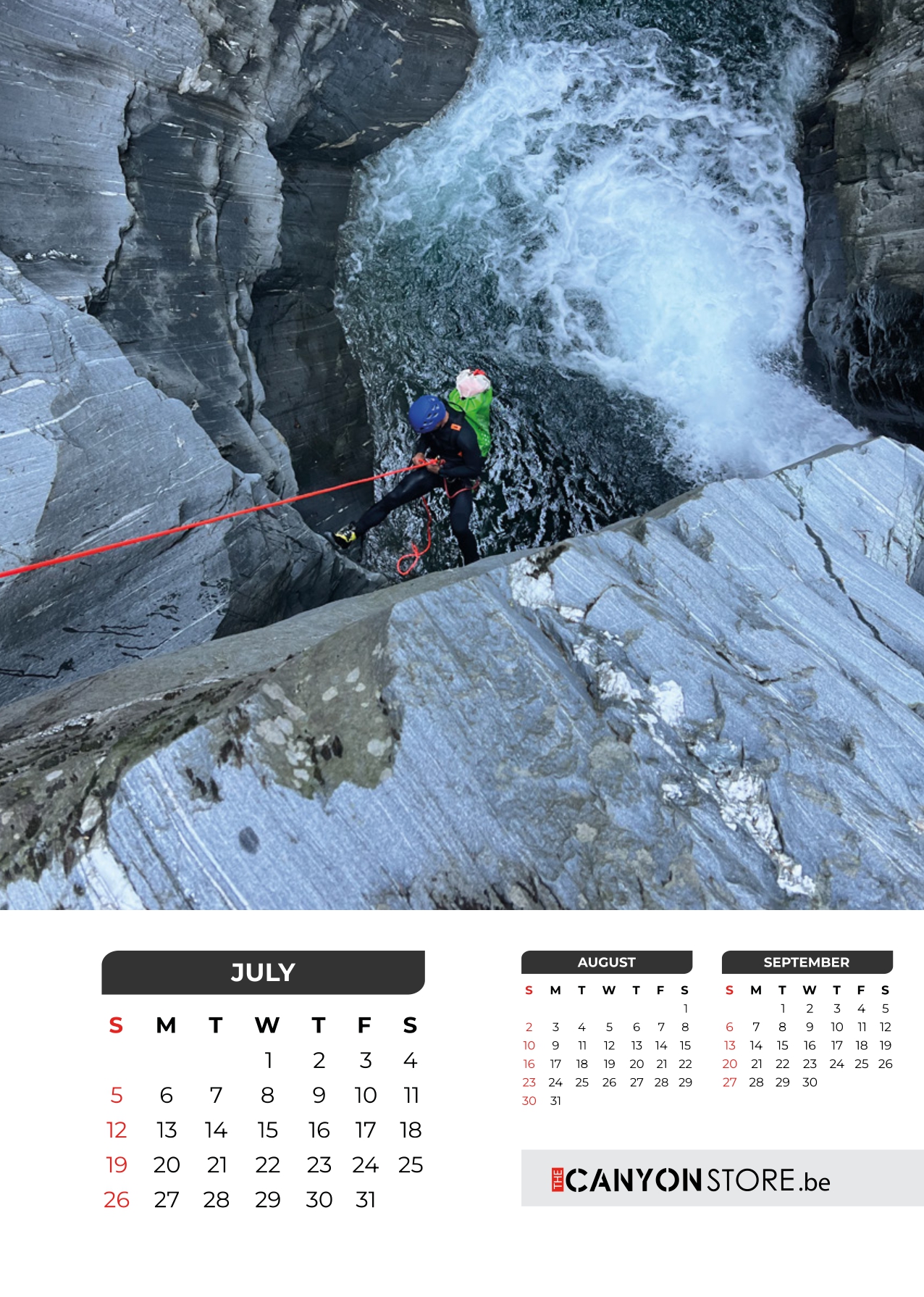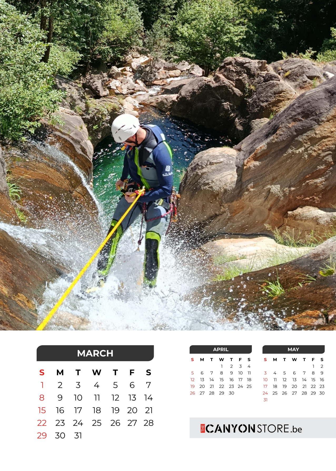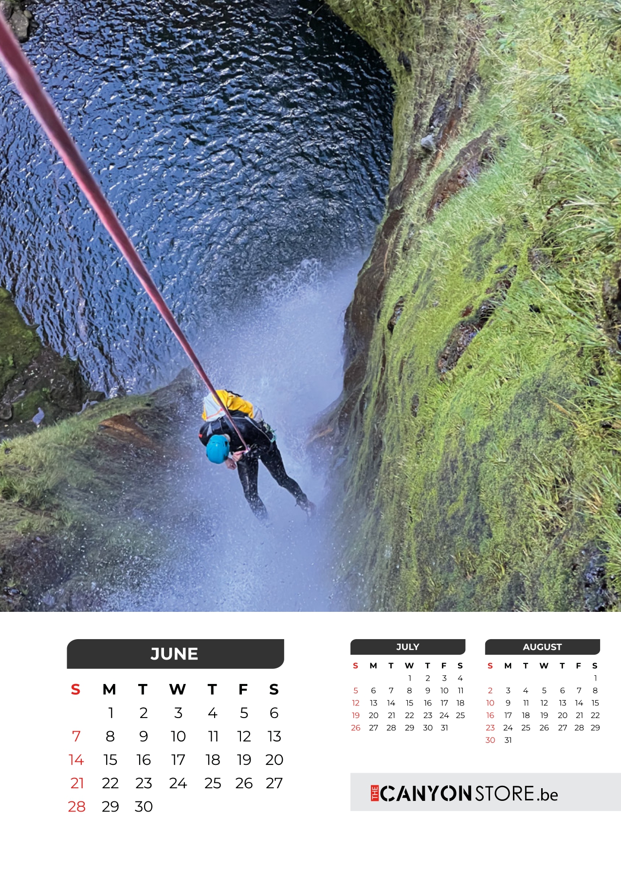 Calendrier mural de format A4, avec 13 belles photos de canyoning. Une photo pour chaque mois, plus la photo de couverture.